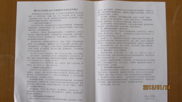 一是学校向每位同学发放桐乡市卫生学校2013年寒假青少年安全自护提示,组织各班全体学生学习;二是组织教师对学生进行急救知识的讲解,开展自护教育黑板报宣传等;三是继续深入开展我校安全法制宣传教育,使广大学生牢固树立“珍爱生命,安全第一,遵纪守法,和谐共处”的观念,养成应对日常生活中突发事件的自救自护能力提高全校学生的安全意识,保障学生健康成长。通过以上途径的教育活动,学生的自我保护能力得到一定提高。