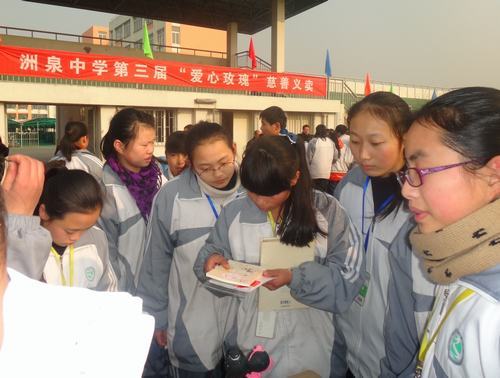 在期末前的几天,洲泉中学的操场上彩旗飘扬,欢笑声、叫卖声,热闹非凡,全校师生都异常兴奋。在一曲优雅的《感恩的心》中,洲泉中学第三届“爱心玫瑰”慈善义卖拉开了序幕。38个班级,38个爱心摊位,每个摊位装扮的各具特色,精彩纷呈。各个摊位上都摆满了书籍、玩具、艺术品、文具等各种义卖商品。前来“淘宝”的老师和同学们都兴高采烈,希望能够赶紧买到适合自己的有用物品。本次义卖活动持续了近两个小时,共筹得善款4000余元,并涌现出了76名爱心大使,他们收到了学校颁发的“洲泉中学2012年‘爱心玫瑰’慈善义卖爱心大使”的纪念奖章。