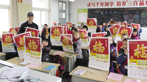 寒假即将来临,桐乡市公安局团委制作了一批印有大红“福”字的年历画,赠送给桐乡各中小学校。警方匠心独运,以形象生动的漫画形式,将当前较为突出的电信诈骗中的8类骗术以及防范对策“镶嵌”其中,让广大师生在“福”气洋洋中,寓“防”于乐。图为1月24日青年民警将年历画送到大麻镇中心学校时,孩子们高兴的场面。