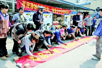 春节过后,返乡过年的民工又重新回到了工厂。正在开展“扫毒害保平安”严打整治专项行动的桐乡大麻派出所,抓住这一有利时机,来到民工较为集中的塑料厂、印染厂等企业,开展禁毒宣传。数百名民工走出车间,在一条写有“毒品之害,祸国殃民,坚决扫除”字样的红色横幅上,郑重地签下自己的名字。