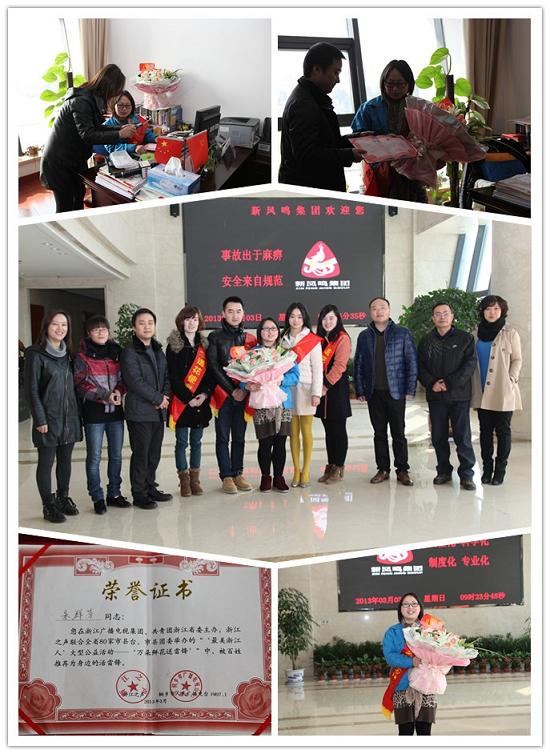 3月3日上午,由浙江广播电视集团、共青团浙江省委主办,浙江之声联合全省80家市县台、市县团委举办的“‘最美浙江人’大型公益活动——‘万朵鲜花送雷锋’”的第一站来到了我镇的新凤鸣集团,桐乡市广电台、团市委的领导为朱群芬送上了鲜花和证书,同时在现场与浙江之声进行了连线,朱群芬呼吁社会各界都应该尽自己所能奉献爱心。