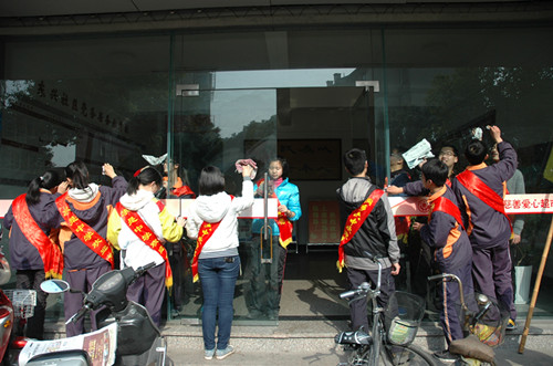 本次,六中与求是的志愿者们再次踏上了“学雷锋”的活动征程,我们彼此间开展了数次活动,为促进学习交流、完善社会公益作出贡献。今天,我们又组成了“学雷锋小组”,到东兴社区打扫卫生。首先帮助附近的社区打扫卫生,抹布、垃圾袋等,并不时用报纸进行深一度的清理,直到窗上门上不见一点污垢才停手。志愿者们沿路还打扫了公益宣传栏等,勤劳的志愿者们为了一块 “牛皮藓”而又抹又抠,尽力清理每一个角落,并细心地寻找路边、草丛花坛中的纸片等,不让路上留下一点不和谐的痕迹。