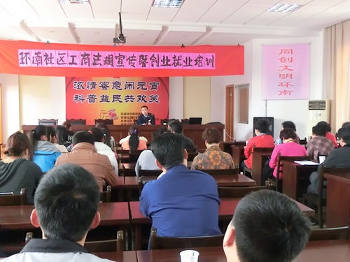 近日,市工商局梧桐所青年志愿者走进环南社区,开展工商法规宣传暨创业就业培训,参加人员包括社区居民、外来务工人员等。整场讲座以生动的案例开头,向听众宣传工商法规,对有意开店的个体商户提前介入,宣传内容从前期选址到不诚信、不规范经营的后果,深入浅出,不仅宣传了守法经营的必要性,更为社区居民、外来务工人员的合法创业指明方向,倡导开放、透明、责任、分享的新商道。