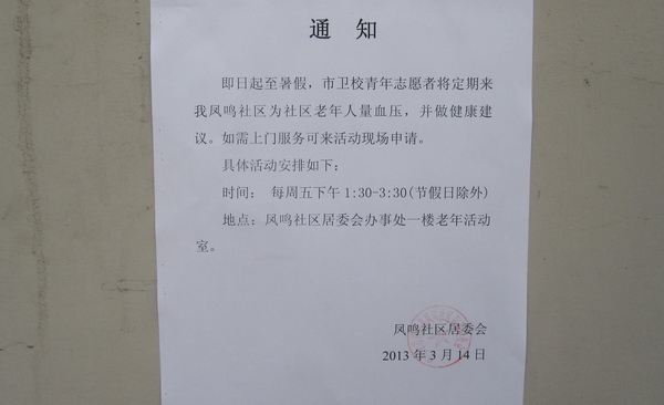 “志愿者”一个赋予圣洁定义的名字,在桐乡卫校学子身上却是如此的夺目。2013年3月14日,一张醒目的通知书张贴在凤鸣社区的宣传橱窗中,桐乡卫校团委组织“微尘”志愿者大队即日起至暑假时间段,每周星期五下午定期为社区的老人提供2小时志愿服务。内容包括量血压、聊家常、义务劳动等,如有居民行动不便,还可以提供上门志愿服务。社区里的老人们看到这张通知后纷纷感慨,表扬桐乡卫校的志愿者们热情又贴心。而志愿者则纷纷表示,一定会将白纸黑字付诸实际行动,志愿服务不是为了收获鲜花掌声,也不是为了博一个良好口碑,而是为了用真诚的心去服务每一个人,用青春的活力去感染每一个人,为群众着想,为人民服务。