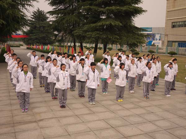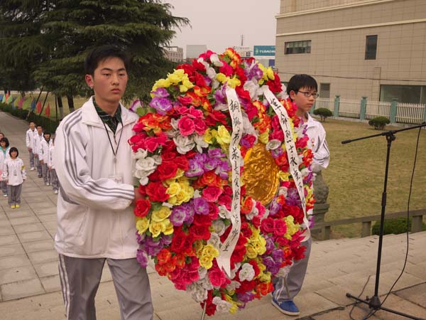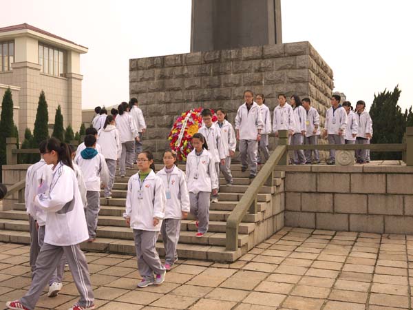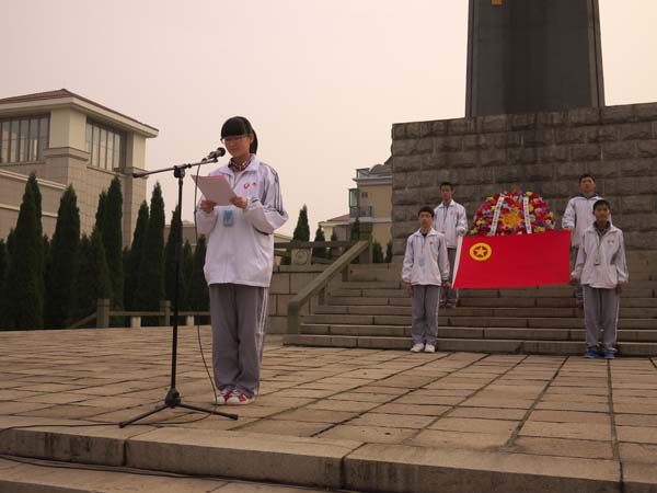 瞻仰活动在新团员们唱出的雄壮国歌声中拉开序幕。在807班施月宇的主持下,4名新团员走向高达21米的纪念碑前,向革命烈士进献花圈,献给敬爱的烈士,告慰英雄的忠魂。紧接着,新团员们诚恳地向革命烈士默哀三分钟并且三次鞠躬,哀乐似乎传达者新团员们对革命烈士的缅怀之情。随后,便开始了求是实验中学八年级新团员庄严、肃穆而富有教育意义的入团宣誓仪式: