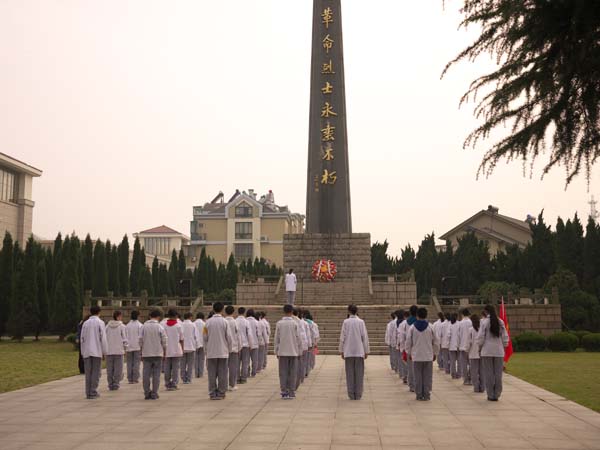 入团宣誓仪式结束后,新团员们怀揣着沉重的心情,和着《国际歌》的声音,绕烈士纪念碑一周。历史的变迁带不走那绽放光芒的丰碑;时代的长河冲不淡那坚硬顽强的岩石;战斗的烈风刮不倒那屹立如松的英魂。烈士的英魂,用它精忠的热血点燃了新团员们内心的火炬。