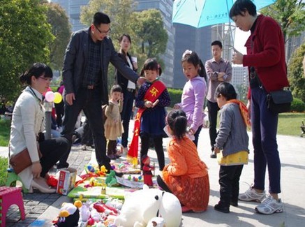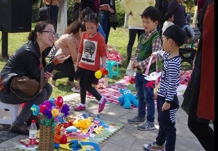 定于上午九点开始的义卖活动,由于准备宣传充分,八点开始就陆陆续续有家庭走进植物园的大门。家长们带着准备已久的物品,根据分配的摊位号,寻找自己的摊位。有的家庭准备充足,桌子、椅子、太阳伞,有的家庭甚至拖着行李箱,装着琳琅满目的物品,更多的家庭把准备好的物品有序的放在地毯垫上,标上价钱,或者由孩子自由买卖,可见家长们对此次活动的重视。这次义卖的商品也是五花八门:有孩子用过的旧玩具,有一家人一起特意从网上淘来的商品,有绿色的盆栽世界,还有一家人精心制作的手工作品……不仅是孩子们,连大人都挑花了眼。