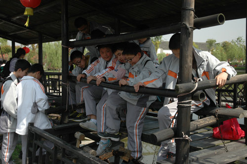 再看休闲区的少先队员们,完全被四下的春光所陶醉,或挤进打制手工年糕的作坊,看看这古老而又新鲜的玩艺,再尝尝刚打制出的香糯可口的年糕;或冲入摆放旧时婚庆嫁娶用具的小院,雕花木床,红萝罗帐,带着少先队员们回到往昔时光,领略一把曾有的民俗文化;或与三五少先队员一起,坐上吱嘎作响的老水车,齐心协力,一起动“脚”,看着哗哗的流水从自己的脚底下泛起洁白的水花,心里甭提有多么快乐!