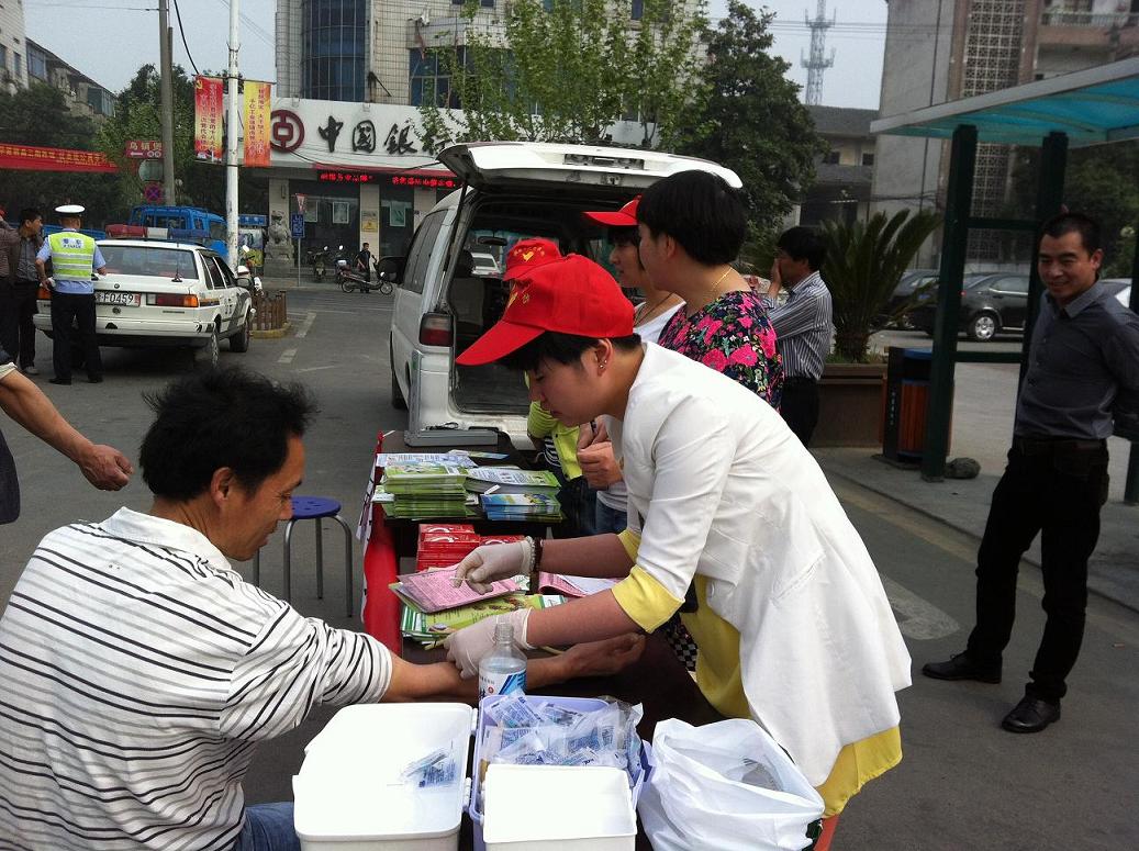 18日一大早,志愿者们就忙碌起来了,他们头戴志愿小红帽,来到该镇闹市区微型公园开展健康义诊活动。在现场内科医生拿起听诊器为过路行人仔细诊疗,并耐心地回答人们的健康提问,而年轻的护士则打开血压计认真地为行人测量血压,还为外来务工者抽血免费检测HIV和梅毒。