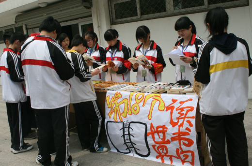 4月23日是第十八个“世界读书日”,为引导学生养成多读书、读好书和爱护图书的良好习惯,市卫校团委组织“义工银行”的志愿者在校图书馆门前设立读书摊,开展以“幸福阅读,助我成长”为主题读书系列活动。学生可以在这里任意翻阅一些书籍,在书籍中获取知识,激起自己的阅读兴趣。