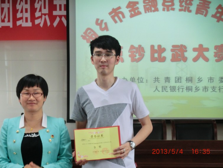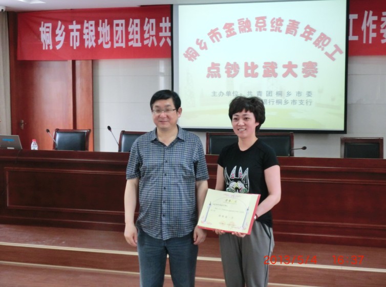 五月四日,在2013年桐乡市金融系统青年职工点钞比武大赛上,桐乡联社参赛选手以其良好的业务功底和比赛风格,在全市十七家银行单位中脱颖而出,荣获团体第一名的好成绩,其中我社有两名选手分获个人金奖和个人银奖,以优异的成绩向五四青年节献礼。