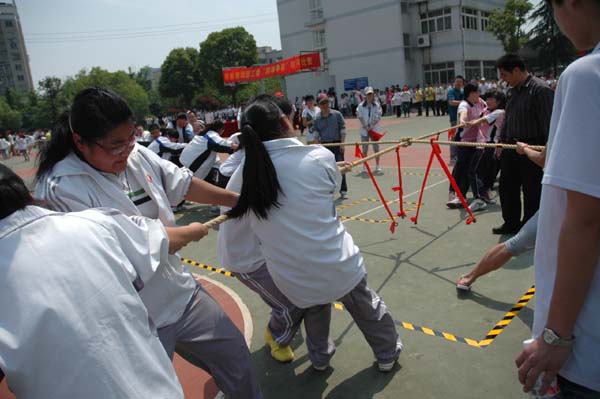 5月12日下午,初夏的阳光格外明媚,桐乡市教育局团工委“四雄争霸”拔河比赛在桐乡一中塑胶篮球场如期举行,来自团工委下属的10所学校共派出16支队伍参加比赛。教育局党委副书记钱峰、团市委副书记沈小炎、桐乡一中校长王金福、副校长金松等领导出席了本次活动并为获奖队伍颁发了奖牌。我校代表队在朱晓红领队、邱执玺教练的指导下荣获第三名(初中组第一名)。