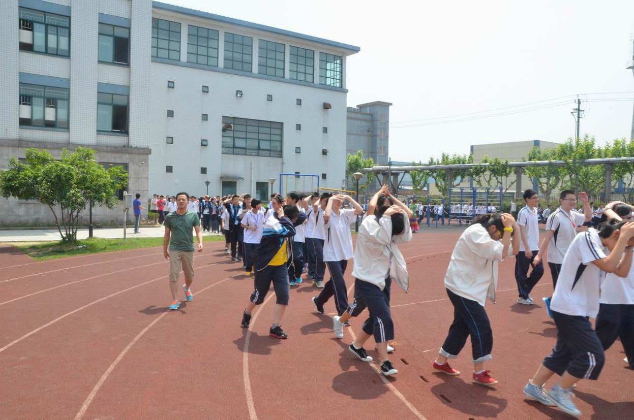 13:20分开始应急避险演练,随着三次短促哨声响起,广播警报信号发出,教学楼教室内的各班学生在班主任和分布在各楼层的疏散引导员带领下,迅速安全有序按预定的疏散的路线紧急撤离到学校西北面足球场,1500多学生井然有序双手护头小步快跑,经清点人数未发生人员走散和伤害事故。