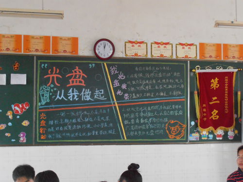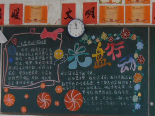“光盘行动”体现的是每个人的品质和责任。此次比赛活动赢得了全体同学地积极参与,在班主任的精心组织下,动手排版、美工、抄写黑板报内容。有的班级还成立设计小组,分工合作,各展所长。通过精心设计,各班板报主题思想突出,图文并茂,色彩鲜艳。学校政教处组织各班宣传委员来到各班进行观看、评审,最后以年级为单位评出了优胜班级。