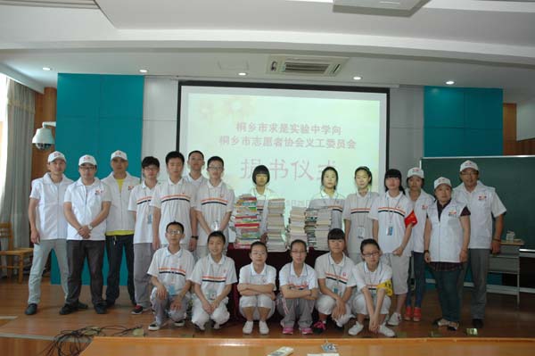 近日,求是中学团委在图书馆多媒体教室举行向桐乡义工委员会爱心捐书仪式。来自全校不同班级的14名学生代表参加了此次捐赠仪式。在此次活动中求是中学团委为积极响应桐乡市义工委员会“为民工子女捐一本好书”活动,利用晨会时间积极发动广大团员青年和少先队员积极参与捐书活动。