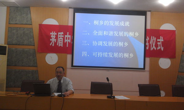 6月3日中午,茅盾中学课余党校在行政楼报告厅举行了第二次讲课。校办老党员陈梁坤老师作了题为《科学发展中的桐乡》的专题党课讲座。陈老师首先谈了自己对科学发展和和谐发展的理解和认识,接着着重介绍了以下四个方面的内容:一是桐乡的发展成就,着重介绍进十年来桐乡取得的伟大成就;二是全面和谐发展的桐乡,从文化、医疗、体育、平安等几个角度阐述桐乡的全面发展;三是协调发展的桐乡,从城乡协调发展和民生工程方面反应了桐乡的发展;四是注重可持续发展的桐乡。最后陈老师向同学们说出了他心目中的桐乡发展蓝图:桐乡市的发展,应在确保保发展、保民生、保稳定前提下,“保生态、创生态”方面力争比其他市区率先做得更好,真正实践森林桐乡,我们年轻的一代学生要关心家乡的发展,要想办法为家乡的美好的未来而努力。