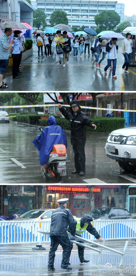 6月7日,2013年全国高考正式拉开帷幕。适逢天气大雨,为实做好高考期间安全保卫工作,给考生创造良好的考试环境,桐乡市公安局提前部署、多警联动,派出青年警力分赴桐乡高级中学、桐乡一中等4个高考考点执行安保任务,为高考保驾护航。图为青年团员民警在雨中维护考场外交通秩序。