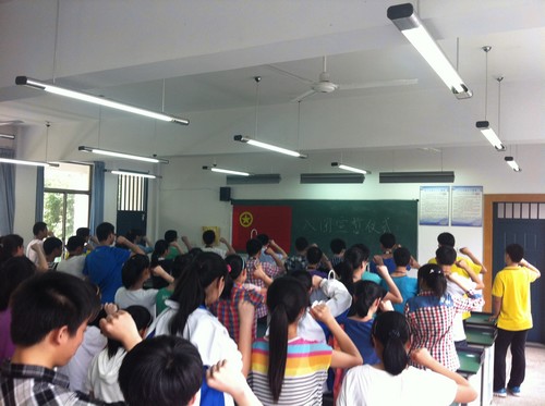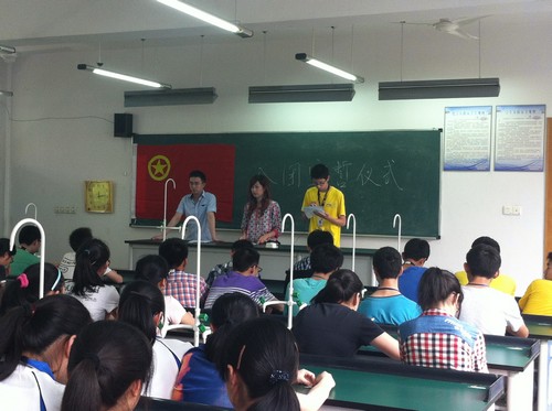 仪式在共青团团歌声中拉开序幕,团员教师沈佳敏、沈青梅诵读了一百多名新团员的名字。全体起立,面对鲜艳的团旗,光荣地佩戴上了团徽。他们举起右拳高声宣誓:“我志愿加入中国共产主义青年团,坚决拥护中国共产党的领导,遵守团的章程,执行团的决议,履行团员义务,严守团的纪律, 勤奋学习,积极工作,吃苦在前,享受在后,为共产主义事业而奋斗!”洪亮的声音,振奋着我们在座的每一位。在这一刻, 我们大家更清楚的认清了自己肩负的责任以及所需履行的义务,用誓言代表了自己无愧的决心。