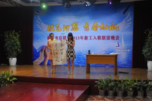 回首昨天,他们刚迈出校门,远离校园生活,走出父母的臂弯;展望明天,他们将踏入社会,迎接职业生涯,融入我们农信的怀抱。对于新员工而言,是兴奋、是向往;对于桐乡信合而言,是欣慰、是期待。晚会在桐乡联社学员们的深情的一曲《爱,因为在心中》拉开序幕,紧接着的诗朗诵《相信未来》展示了农信青年们继往开来,共创辉煌的豪情壮志,在一曲应景的《宁夏》之后,《舞蹈串烧》舞出了我们信合青年员工的精神风貌,而接下来的知识有奖问答更是将气氛推向高潮,在座青年们纷纷踊跃抢答,展现了农信青年娴熟的业务知识。