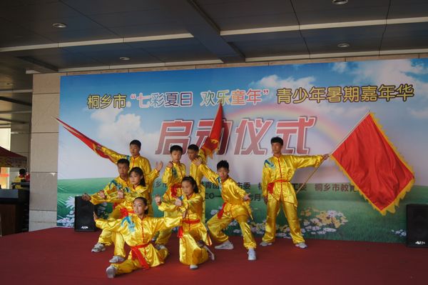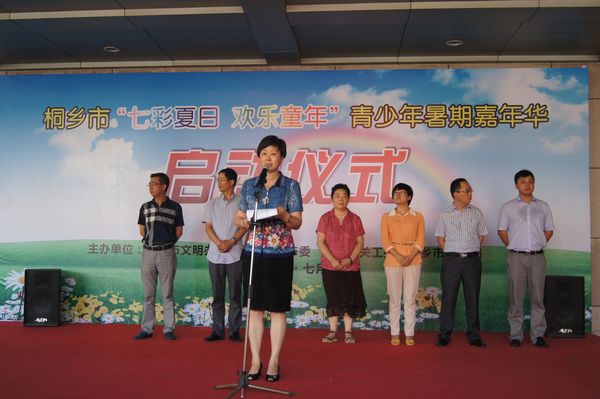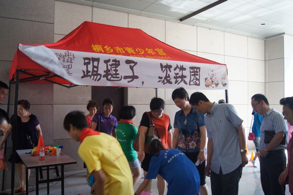 在启动仪式上,相关部门领导为红、橙、黄、绿、青、蓝、紫七支青少年暑期嘉年华小分队进行了授旗,聘任了一批青少年暑期嘉年华小分队辅导员,举行了第二届桐乡市青少年创意嘉年华,200多名青少年体验了溜溜球、踢毽子,滚铁圈、捉七等传统少儿童玩游戏。