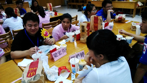 在彼此渐渐熟悉之后,中午的午餐会上,高中生们与社会实践队员便在轻松的氛围中谈天说地,彼此交流自己对于学生这一角色的看法——从团学工作到寝室生活,从学术钻研到运动娱乐,从完成作业到个性发展,同学们的观点各异,又充满活力。对话中,高中生们见识到了大学生活的丰富多彩,感受到了大学生的魅力,内心充满了对大学的向往和期待,对于他们而言,这实在是一份可口美味的“心灵汤”,滋润心田。