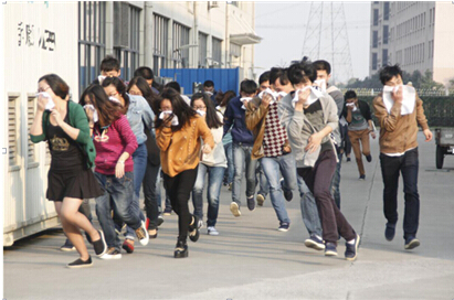 下午3点整,警报声骤然响起,全体员工迅速做出反应。企业义务消防队在最短时间内赶至相关区域及时进行指挥和疏导工作,员工们在第一时间内弯腰捂鼻、组织有序地从各个车间按既定路线向操场空旷地带疏散,仅一分四十秒,全部人员均“安全逃生”。