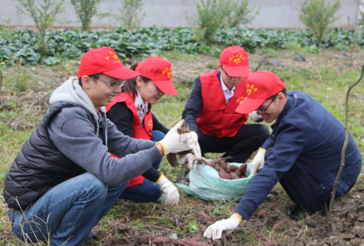 由于前一天的一场雨,使得番薯地有些泥泞,团员青年们穿上雨靴、带上麻手套,小伙扛铁耙,姑娘拿种刀,个个热情高涨。一到地里就撸起袖子挥锹铲土,翻的翻、挖的挖,全身心地投入到劳动中,尽管满头大汗,身上溅满泥水,手上也被铁耙磨出了水泡,但田间地头充满了欢声笑语。团员青年们发扬农信人的“三水精神”,干得兴致勃勃,通过一下午的辛勤劳动收获了整整四大麻袋的红薯。