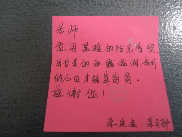 活动当天,有的同学前去张贴感恩节海报,鼓励同学们“爱要大声说出来”。有的同学在老师的办公室里忙碌着,偷偷地帮老师打扫办公室,让老师有一个舒适干净的环境。还有的同学在每一个老师的办公室门口贴上亲手写上的感恩语。同时,通过蒲公英广播站,在校园里播放《感恩的心》,带动全校同学一起学唱《感恩的心》,让每一位同学都用积极的行动表达自己对老师的感激。一个表达自己心意的平台,一次学习感恩的机会,一场唤醒爱的活动——感恩,我们在行动!