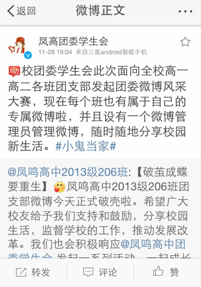 为了充分发挥凤鸣高中团支部的舆论宣传阵地和教育引导的作用,调动各团支部的积极性,推动团的工作,服务青年成长,形成良好的校园文化,凤鸣高中团委利用新媒体平台,精心策划了校园团支部微博风采大赛,并于12月1日正式启动。