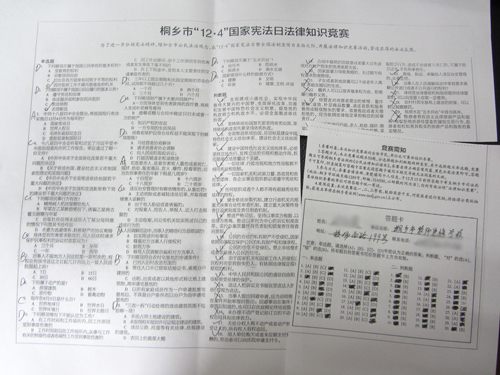 4.组织法律知识竞赛。为落实宣传和实习效果,印发《桐乡市“12.4”国家宪法日法律知识竞赛》试卷,以赛促学,让团员青年充分参与到宪法的学习中来。