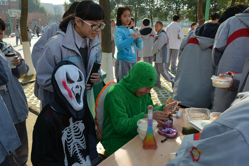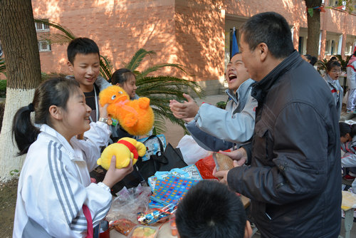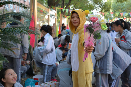 此次活动受到求是广大师生的大力支持与热情参与,很多师生按捺不住激动的心情,在13点前就有条不紊地做准备工作,在各自的摊位上摆好出售的物品,迎接顾客的到来。13点,“万事俱备,只欠东风”,跳蚤市场准时开始。七、八年级的学生陆陆续续到来,不久,求是大道上人头攒动,整个校园气氛瞬间热烈了起来。每个摊位的同学,都不遗余力、尽其所能地施展自己的才能,期待能将自己摊位的物品推销出去。瞧,他们有的穿上动物造型的衣服,吸引同学们的眼光和注意力;有的采取送赠品的策略,买就送;有的一边弹吉他,一边忘我投入地歌唱;有的一边将要卖的物品拿在手上,一边大声地吆喝着……每个人脸上满满都是比阳光还灿烂的笑容——无论卖或没卖出什么,无论买或没买什么。