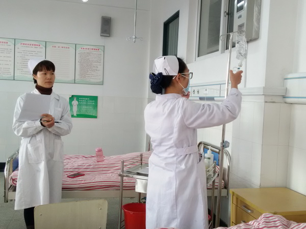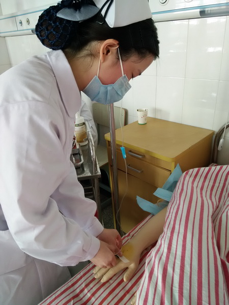 该比赛以“静脉输液”为考核项目,共有50名高二学生和3名高一学生参赛。比赛分为2组进行,每组评委老师有四名,通过制定相关操作技能评分细则,严格考核,集体打分,秉着公平、公正、公开的原则,力求真实反映出护生的业务技能水平。操作台前,参赛选手们都身着护士服,头戴护士帽,白衣天使的形象屹立于各评委老师眼前。她们端庄大方的姿态,熟练准确的操作,每一个动作都是精细至微,无不传达出对病人的无限关爱。