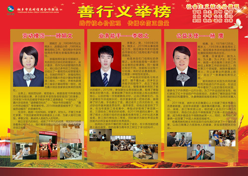 一是唱响人人做好人的主旋律,把好人树起来,让好事晒出来,一个善行义举榜在桐乡联社内部产生广泛的示范带动效应,涌现出道德模范、身边好人。