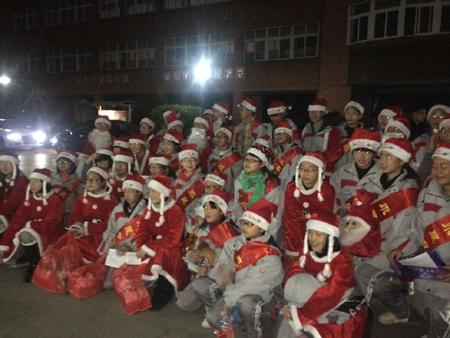2014年12月24日晚5:30桐乡求是中学702全体师生和部分家长在求是中学东门广场齐聚一堂,这是由求是团委组织的702班“平安送祝福”平安夜爱心义卖社会实践活动即将启程。此次活动义卖的所有善款将全部存入学校爱心基金,并于2015年5月全部捐献给外来民工子女学校桐乡世纪路学校的结对学生。