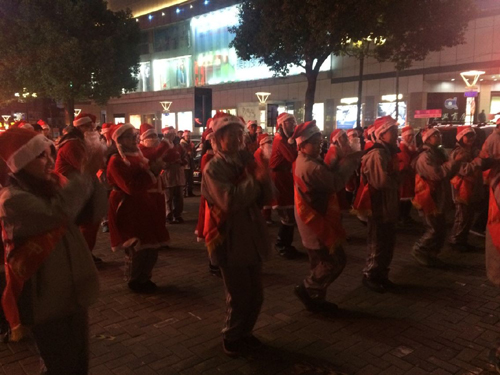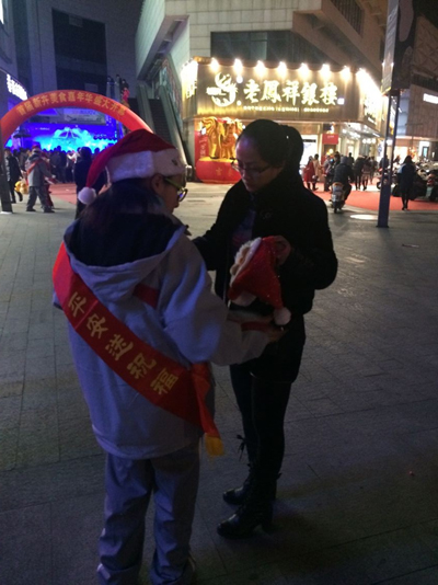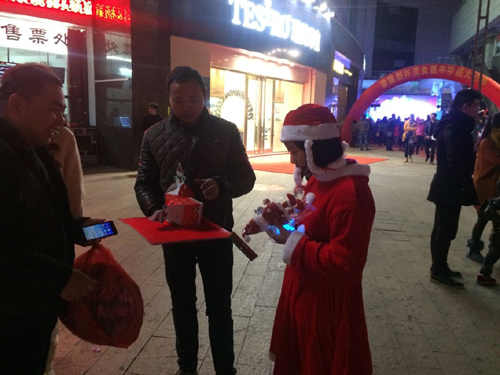 晚6:00所有的“圣诞宝贝”们来到“太平安购物中心”广场,首先“圣诞宝贝”们带来了精心准备的排舞表演“小苹果”,红红的圣诞装、浓浓的圣诞情,为现场的观众和路人送上平安的祝福。紧接着各小组在志愿者老师的带领下分别来到了东兴广场和新卉购物中心广场,“叔叔,圣诞快乐!祝你平安!买一个苹果献一份爱心吧!”“阿姨,祝你平安,给小妹妹买个圣诞帽,为贫困学生献一份爱心,送一份祝福吧!”志愿者们不断向路人送出平安的祝福同时也向大家发出爱心的呼唤。“你们是爱心义卖,那我们也献一份爱心!”“我要两个个,也祝你们平平安安,学习进步!” 很多朋友得知爱心义卖平安果和圣诞小礼物是要帮助外来民工的贫困子女,非常支持,有人买苹果也买小礼品,还有人只捐款不要苹果。
