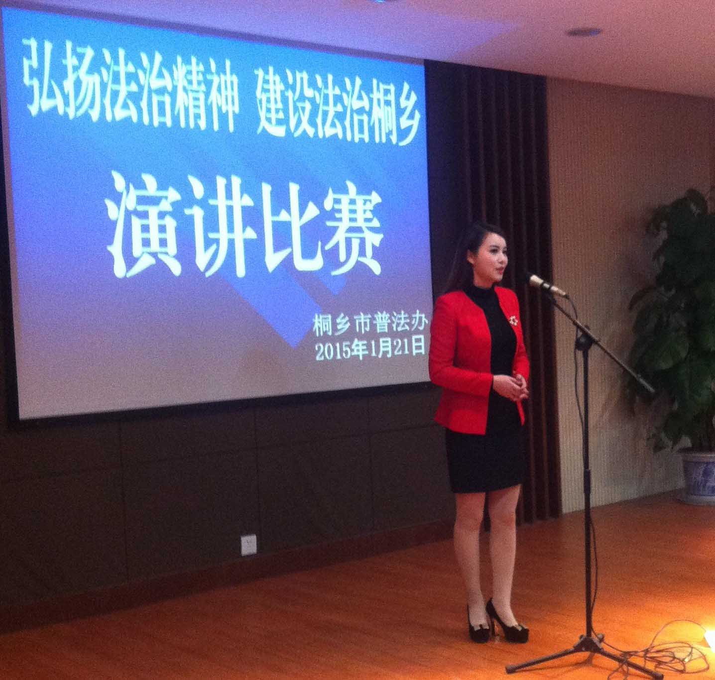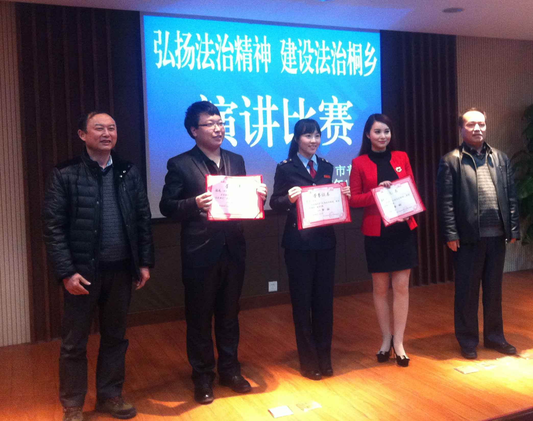 选手们围绕“弘扬法治精神、建设法治桐乡”这个主题展开演讲,有的慷慨激昂,有的娓娓道来,内容详实,感情丰富,广电台青年团员徐丹发挥自身专业优势,以《我的法治情 我的中国梦》为题,展开了演讲,演讲内容深入浅出,寓理于事,语言流畅,富有亲和力,得到了评委和现场观众的一致好评,最后以9.71分的高分获得了比赛一等奖。