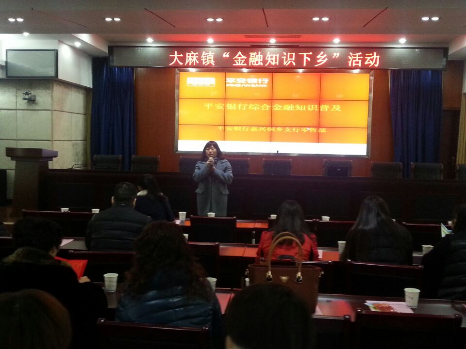 2014年大麻镇金融诈骗案件多发。为进一步提高公众金融的安全意识,提高公众的金融知识水平,2015年2月28日,大麻镇团委联合妇联、综治等多家单位与平安银行在镇六楼会议室开展了金融知识下乡活动,通过平安银行青年员工生动形象的演讲从而使得金融知识能够得到更加直观的传递到老百姓中。