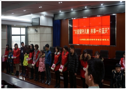 截止2014年年底,大麻镇学龄段留守儿童有194名,约占全部学生总数的10%左右。针对我镇留守儿童较多现实情况,3月6日下午,大麻镇团委在大麻镇政府6楼大会议室组织开展了“关爱留守儿童 共享一片蓝天”志愿者结对活动启动仪式。本次结对活动共有10名儿童作为全镇留守儿童的代表参加。镇团委在前期志愿者招募的基础上精心挑选了10名青年志愿者与他们结对。活动现场,青年志愿者向留守儿童们赠送了书本、学习用品等工具,并鼓励孩子们在平时的学习和生活中多与他们联系,共同进步成长。在下一阶段,大麻镇团委将在全镇铺开志愿者与留守儿童结对工作,把更多的退休教师、青年党员、妇女小组长等人纳入到结对志愿者中来,真正在全镇形成一个关心、关爱留守儿童成长的氛围。