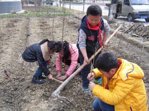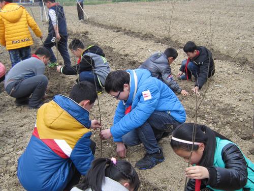植树活动中,少先队员们热情高涨,平常连锄头都没有摸过的队员们,此刻却有板有眼地当起了“校园美容师”。队员们二人一组,一个扶着树苗,另一个填土,干得热火朝天。他们中大部分的队员都是第一次参加植树,动作不够娴熟,但这丝毫都不影响他们为校园添绿色的积极与热情。一眨眼的功夫,在队员们的辛勤劳动下,树苗很快就种好了。轻柔的春风中,队员们看着自己亲手种植下的一棵棵小树,畅想着数年以后它们慢慢长大,枝繁叶茂。