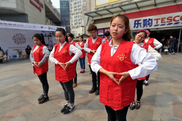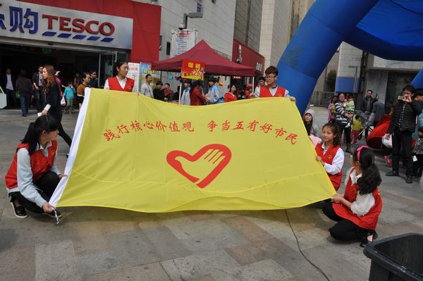 当天下午13:30点左右,当有市民志愿清理垃圾时,志愿者们便从四面八方汇聚,开始表演手语《感恩的心》等活动,来赞美志愿者精神,就在大家驻足观望之际,音乐突然停止,志愿者们站好队形,亮出“人人争当志愿者 个个传递正能量”、“践行核心价值观 争当五有好市民”的口号旗帜,随后志愿者们迅速撤离。在场围观的市民纷纷被这新颖的活动形式吸引,有市民表示这样的活动既新鲜又有意义,让自己也有了加入志愿者队伍的冲动。