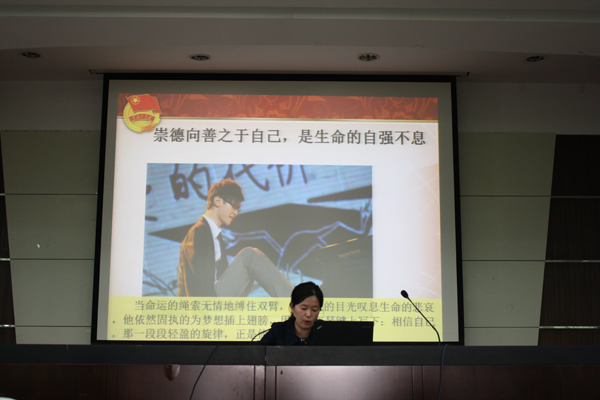 桐乡一中团委委员周潇老师,通过社会主义核心价值观:“富强、民主、文明、和谐、自由、平等、公正、法治、爱国、敬业、诚信、友善。”三个层面的含义,突出了本次教育的主题是——“崇德向善,培育和践行社会主义核心价值观”周潇老师。周潇在讲课中指出崇德向善就是崇尚学习,尊重知识,中学善思,追求真理。课中引用了感动中国人物刘伟历经磨难成才故事和一中老教师钟玉良老师援藏支教的故事,一个是珍爱生命为自己生命负责,一个是敬业友善为工作为国家负责。他们都完美地诠释了崇德向善的精神。学员们认真讨论、积极发言,报告厅中洋溢着欢乐的气氛。
