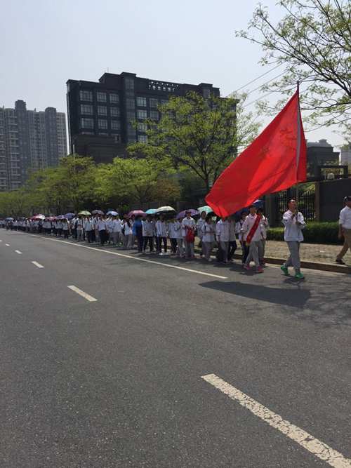 下午12::45分高一各班在校门口集合整队,政教主任王辅国强调了本次社会实践活动的注意事项,要求全体同学严格遵守参观纪律,感悟桐乡传统文化的同时,要确保安全、文明、有序地参观。远足途中,学生们在老师的带领下,秩序井然,唱班歌,喊口号,精神抖擞,体现了良好的茅高学子风貌。经过半个多小时的徒步,下午13:30茅盾中学师生来到桐乡市文化中心。