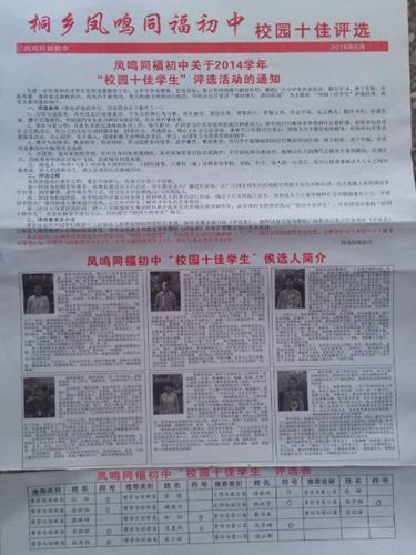为切实推进未成年人思想道德建设工作,树立一批具有鲜明时代特色的先进学生典型,让学生学有楷模,赶有目标,激励广大中小学生热爱祖国,勤奋学习,积极进取,勇于实践全面提升学生素质。近日,凤鸣同福初中团总支部在全校学生中开展了以感动师生、感动校园为主题的“校园十佳学生”评选活动。
