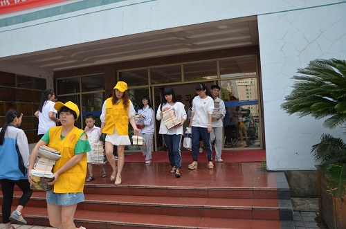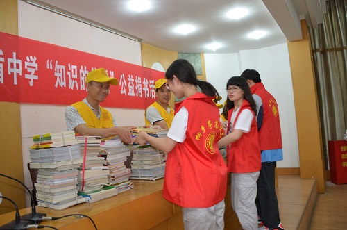 茅盾中学一直以来致力于崇德向善公益事业,团委不仅与敬老院形成固定爱心结对单位,还积极致力于“五水共治”、福利院六一活动,学雷锋活动月,茅高义工每月开展多种义工活动等,并成立专门的爱心基金,每月将每个班级卖废品的钱作为定点爱心基金,服务于校内外公益事业。本次捐书活动有48名茅高义工参加,在爱心联合会朱林法老师的公益事业讲座下拉开序幕,朱老师呼吁学生积极参与到社会公益事业中,为那些真正需要帮助的群体送上自己的绵薄之力。茅盾中学茅高义工们将自己班所捐的书郑重而真诚的一一交到爱心联合会张剑、秋秋等老师的手上,并打包协助统一装到爱心车上。