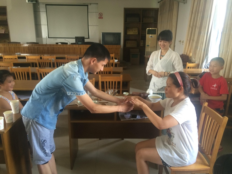 本次体验课的精髓在于孝文化的展现。“妈妈,请您喝茶。”看到妈妈通过颤抖的双手接过品茗杯的时候,这次茶道课中的孝文化得到了完美的诠释。手拿茶杯并以90度鞠躬将其递上,简单的肢体动作中渲染着感动。妈妈一边喝茶,一边眼睛望着自己的孩子眼神中传递着妈妈此时此刻内心深处无比激动的心情。在活动结束后,通过与家长的交流中,我看到的是为人父为人母无以言表的兴奋。同时,他们口中反复说着的“孩子长大了”“这样的活动多搞搞”的话语,肯定了此次活动的价值。