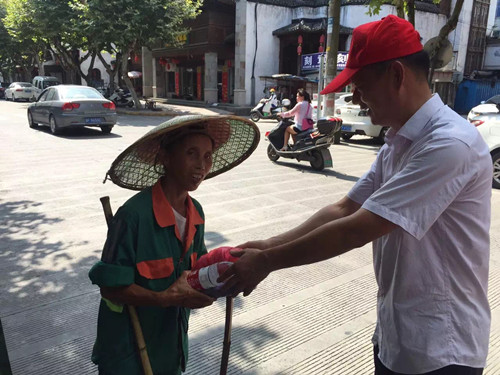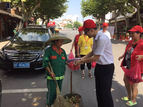 夏日炎炎似火烧,连续多日38摄氏度的高温天气,没有一丝凉风。一些室外工作者却在高温下坚守,“城市美容师”——保洁工人便是如此。为改造社会责任, 近日,桐乡联社团委开展了“夏季送清凉”活动,旨在慰问奋战在高温一线的劳动者。