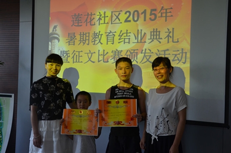 快乐的暑期还在进行当中,莲花社区的暑期教育活动已经接近尾声。8月3日上午,二楼活动室迎来了许多中小学生,结业典礼上,大家观看了禁毒电影《小法科科反邪教》,然后,莲花社区书记杨瑞英公布了以“铭记历史 圆梦中华”为主题的征文比赛获奖名单,共有陈了、魏可为等8名中小学生分别获得了一、二、三等奖 ,并为他们颁发了奖状和奖品。