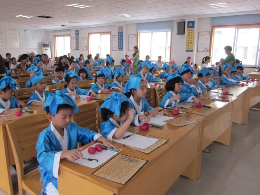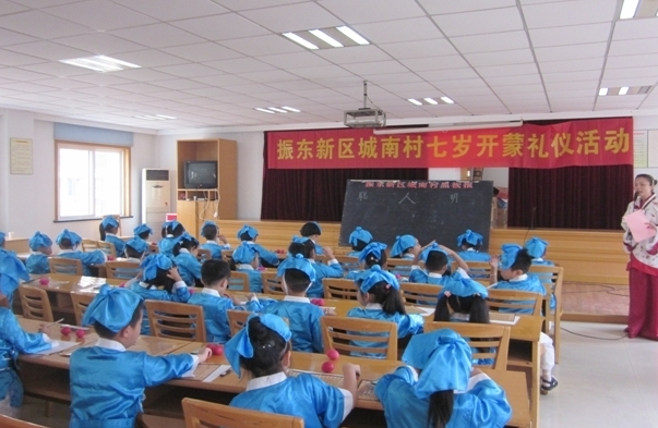 8月26日上午,振东新区城南村40多名即将上小学一年级的孩子,在家长的见证下接受了村里德高望重的老教师杨老师的开蒙教育。通过正衣冠、拜师礼、互敬礼仪、点朱砂、诵读《弟子规》、写“人字”等形式,学习做人的基本道理。