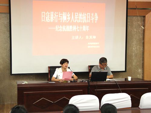 为纪念中国人民抗日战争暨世界反法西斯战争胜利70周年,推进爱国主义教育,9月2日下午,凤鸣同福初中邀请原桐乡市石门中学校长、桐乡市关工委讲师团朱其坤,在学校阶梯教室开展了一次“纪念抗战胜利70周年”为主题的专题讲座活动。