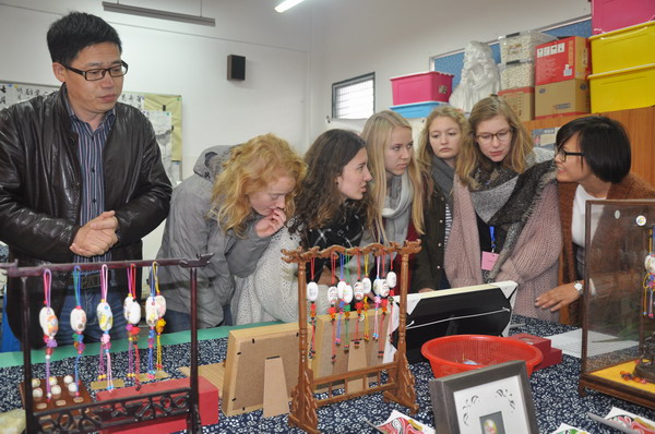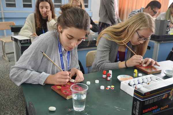 桐乡素有丝绸之府的美誉,为了让比利时师生尽快了解桐乡、认识桐乡,在参观结束后学校安排的第一个特色课程就是江南茧画制作。在陈建清老师的陪同下,大家参观了陈老师的工作室,对茧画工艺品叹为观止,认为这些可谓鬼斧神工。“接下来,我将教大家一起制作这样的工艺品。”当得知陈老师将手把手教他们的时候,他们个个摩拳擦掌,对这个课程既好奇又期待。课堂上,他们手握画笔,无论是老师讲解,还是动手实践,他们都认真仔细听着,画着。“我从来未曾见过蚕茧,更难想象在它上面还可以创作如此精美的图案。”其中一位女同学这样告诉我们的翻译。课堂最后大家还将自己的作品珍藏留念。